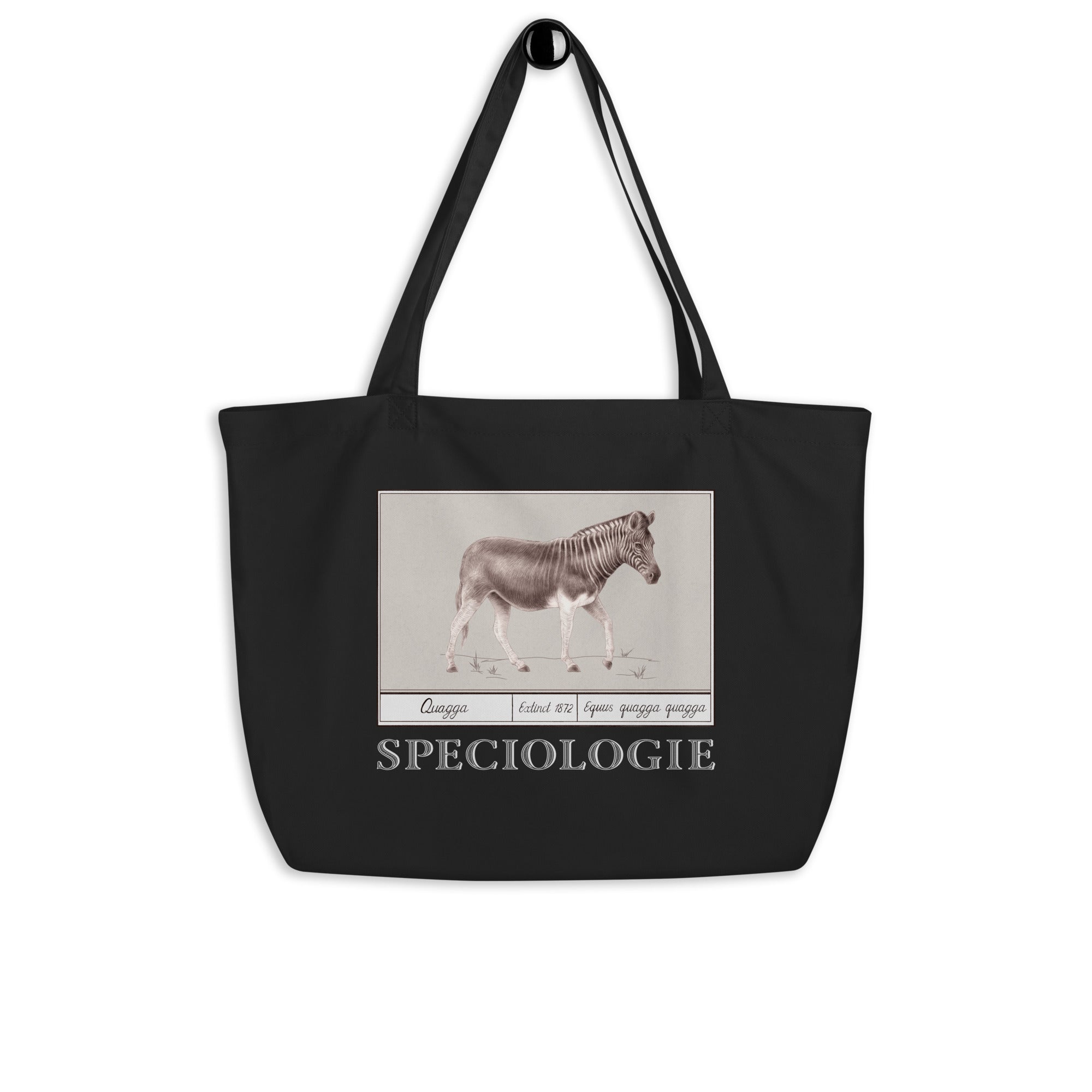 Extinct since 1872, the Quagga was identified in indigenous cave art and photographed once in 1870. Our Quagga oversized (20″× 14″× 5″) Organic Cotton Tote is a striking, functional bag made of durable 8oz 3/1 twill fabric. This dual strap, flat bottom tote can fit a whole lot of groceries, books, or other essentials. Every purchase contributes to endangered species survival through donations to scientific conservation efforts. #Speciologie